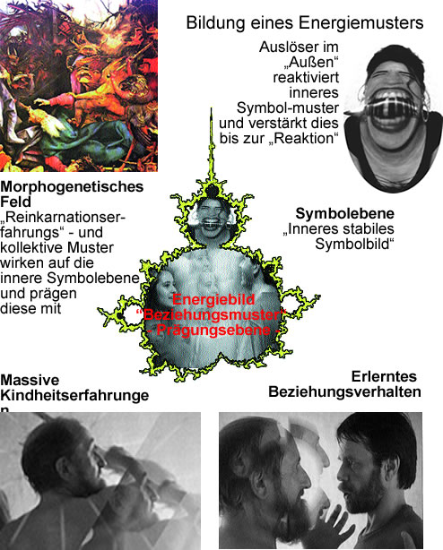 Alle massiven Erinnerungen prägen sich ein. Hat z.B. ein Mann in der Kindheit eine lieblose Mutter gehabt und einen Vater, der sein männliches Selbstwertgefühl mit Schlägen zerstört hat, ist seine Energiebildstruktur bezüglich Beziehungen deformiert. Lernt er jetzt die schwärmerische erste Liebe kennen und bekommt durch sein ungeschicktes Verhalten weitere Selbstwerteinbrüche werden seine inneren Symbolbilder dies integrieren: Eine innere agressive Frau entsteht. Bekommt er später in diesem Kontext einen massiven Auslöser - Freundin geht fremd ?- kippt die Struktur in eine unbe-wußte Handlungsanweisung und er rastet unangemessen aus! |